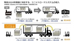 その中で同社は、調達先からの輸送、庫内荷受け、搬送、格納までを一気通貫でカバーするユニットロードシステムを導入した。同システムは、回転式パレット「Vパレ」と回転フォークリフトを組み合わせることで、スピーディかつ効率的な「パレット積み・パレット降ろし」を実現するもの。これによりドライバーの負担を大幅に軽減するとともに、トラック積み込み・積み降ろしにかかる作業時間を約87.5%短縮(約240分から約30分に削減)することに成功した。